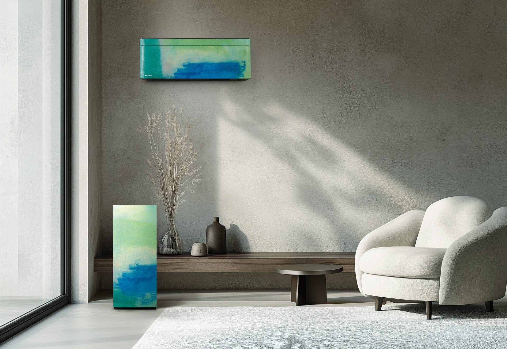 画像は肥後さんの作品「みず」を使用した見て目にも涼しいエアコンです。